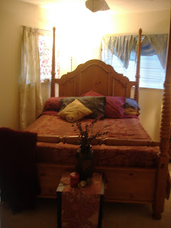 It's a little bit hard to tell in the pictures, but the bed is now at an angle, and we have this sitting area in the corner for my hubby to have his quiet time. I am happy to see the coffee coaster and the books on the floor near his chair, knowing that he is enjoying his new private space.